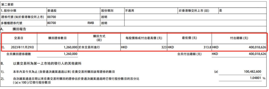 11月29日,腾讯在港交所披露,当天再次回购了126万股,回购价格在313.8港元/股至323港元/股,合计斥资4亿港元。