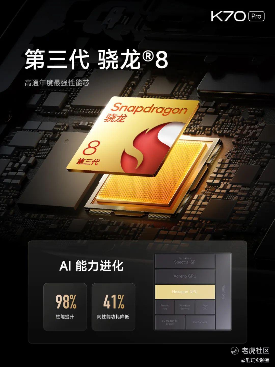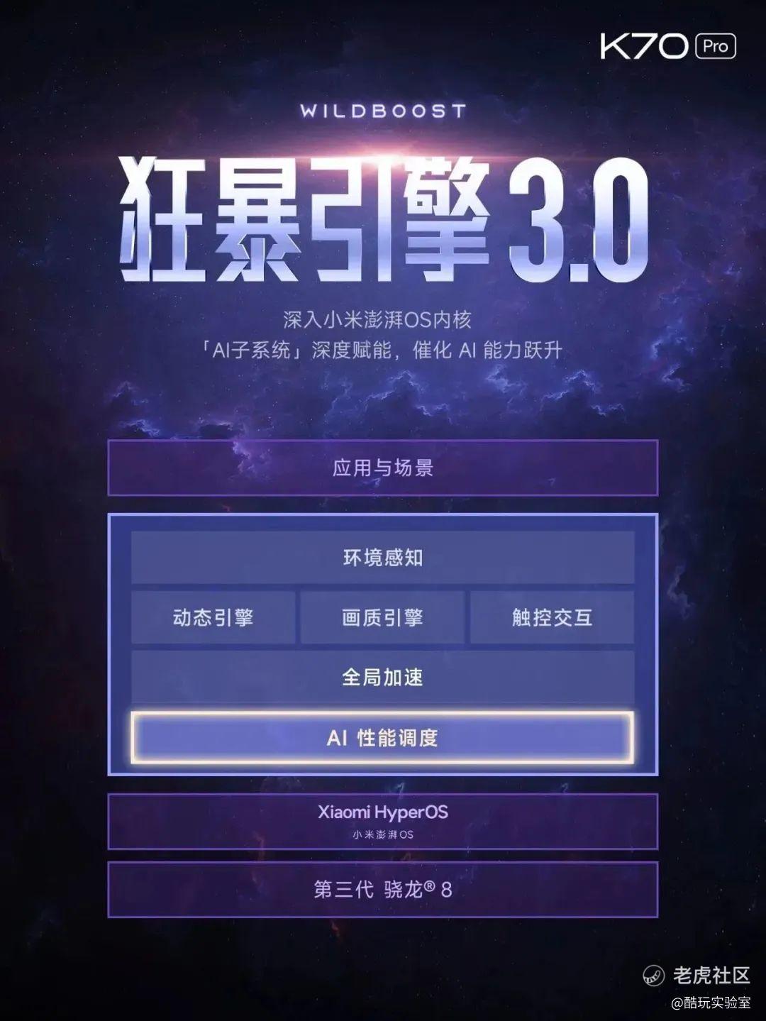 除了传统性能上的进步,第三代的骁龙8处理器在AI计算上还有着非常大的提升。以榨干性能为主的K70也没有浪费这块算力,推出了基于澎湃OS的狂暴引擎3.0。