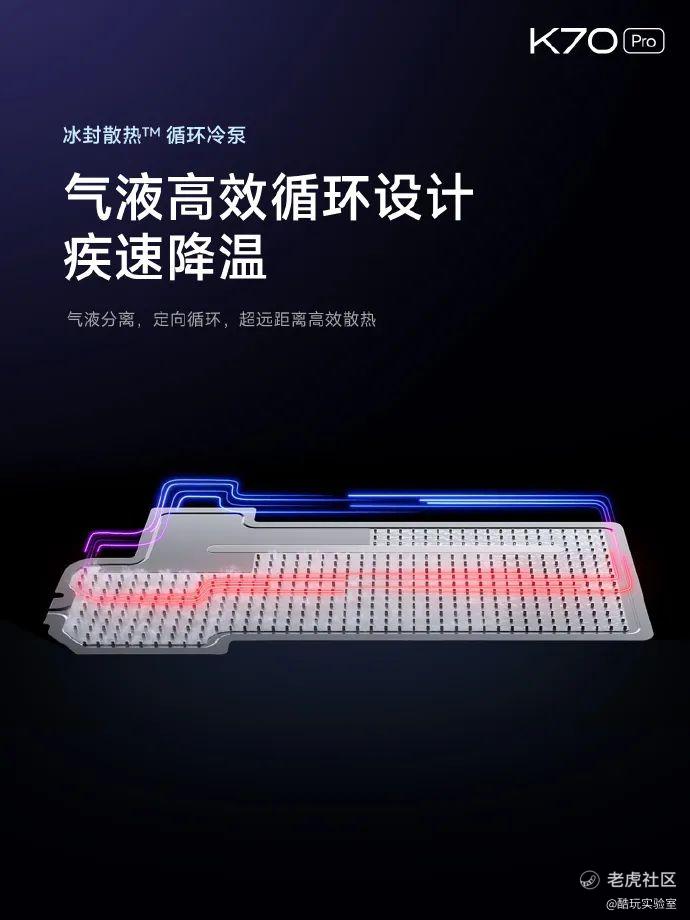 除了地表最强的Soc——骁龙8Gen3以外,K70 Pro也配备了LPDDR5X和UFS4.0的存储配置。集齐了“3+4+5”的顶级配置,还要有对应的散热。