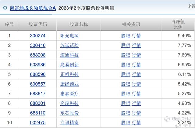 排除掉细分赛道碳中和主题基金,以海富通成长领航混合为例,2023年2季度,该基金前十大重仓股包括:阳光电源、道通科技、康缘药业、惠泰医疗等。