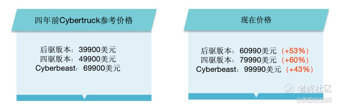 后驱版本的起售价为39900美元。然而,现在这款车的价格已经上涨到了60990美元,涨幅高达53%。而四驱版本的Cybertruck更是不得了,四年前它的参考价格是49900美元,如今已经狂涨到79990美元,涨幅居然高达60%! $特斯拉(TSLA)$ $Rivian Automotive, Inc.(RIVN)$ $福特汽车(F)$ $蔚来(NIO)$ $小鹏汽车(XPEV)$