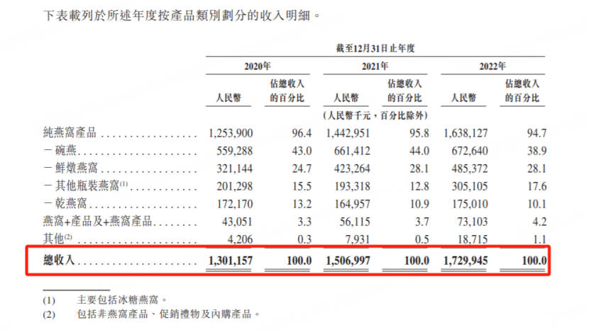 纯燕窝产品主要包括碗装燕窝产品系列「碗燕」、主要供应电商消费者的瓶装燕窝产品系列「鲜炖燕窝」、瓶装冰糖口味燕窝产品系列「冰糖官燕」、可供客户自行加工的传统燕窝产品系列「干燕窝」等;