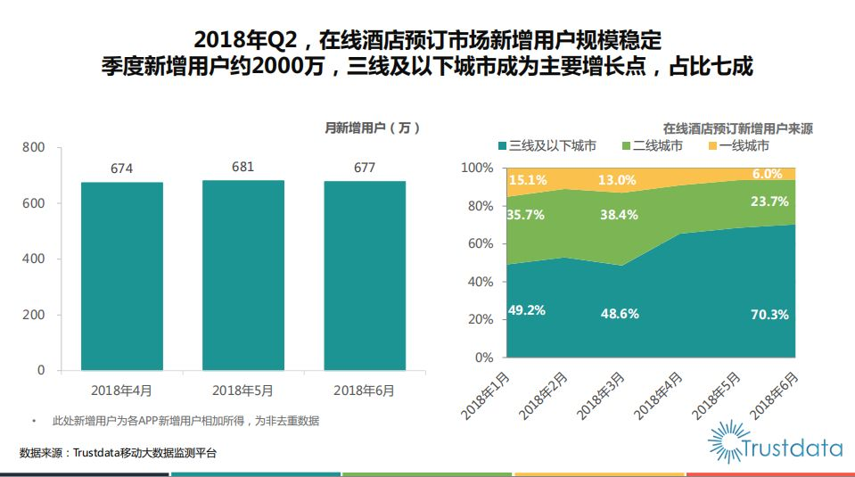 诚然,一线城市经济文化发展前卫且占据消费主话语权,但低线城市同样拥有巨大潜力,依托渠道下沉可以覆盖更为广阔的用户人群。据Trustdata报告显示,2018年Q2在线酒店预订市场新增用户规模稳定,季度新增用户约2000万,其中三线及以下城市成为主要增长点,占比高达七成。可见,三线及以下城市虽渗透率低,但其消费能力正在逐步释放,未来也将继续成为在线酒店预订行业的重要助推力量。