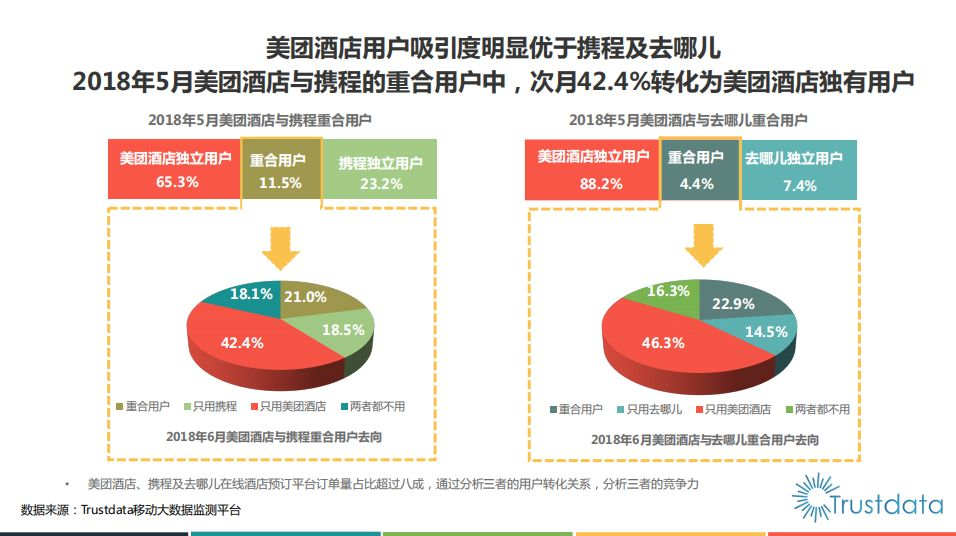 人一旦形成习惯后,往往就不会轻易改动,美团一站式生活服务正在培养用户的路径依赖,增强用户对于超级平台的粘性,并让传统OTA成为用户心中回不去的“前任”。Trustdata报告中也提到一组数据,2018年5月美团酒店与携程的重合用户中有42.4%在次月转化为美团酒店的独有用户,前者对于用户的吸引力明显高于后者,在此过程中不仅夯实了美团的平台壁垒,更为培养“超级用户”奠定了基础。