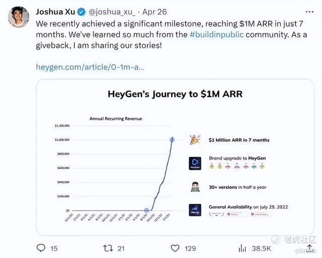 对此,有人认为,HeyGen是在“闷声发大财”。虽然猎奇玩家散去了,但留下来的用户还是给HeyGen贡献了收入增长,HeyGen连续九个月环比增长率在50%以上。创始人Joshua Xu也在社交媒体上公布了相关数据,仅七个月时间,ARR年度经常性收入就达到了100万美元。