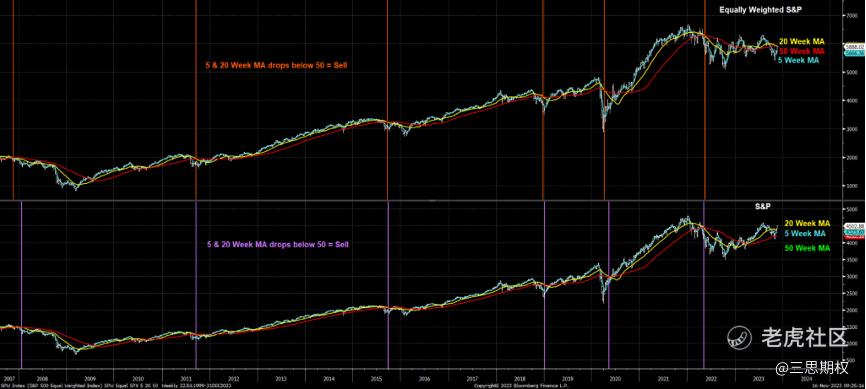 如果美股未来一段时期出现压力、只有七大科技股依然坚挺,那么等权标普指数可能会重拾跌势甚至出现明显的看跌信号(5周和20周移动平均线低于50周均线)。