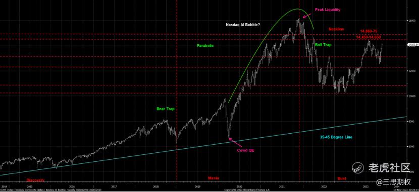 图:纳斯达克(NDX)的走势,存在牛市陷阱或是双头结构的风险