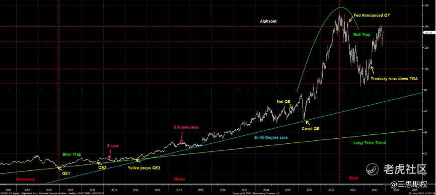 事实上,谷歌(下图), $Meta Platforms(META)$ 、 $亚马逊(AMZN)$ 甚至 $奈飞(NFLX)$ 等科技巨头的走势似乎正在复刻纳指的走势,都是这么一个离高点这么近、又这么远的距离。