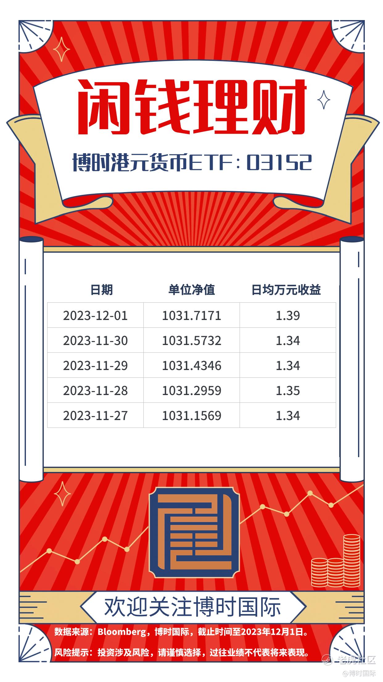 博时港元货币基金ETF最新收益播报:日均万元投资收益1.39元,老虎账户输入03152即可直接购买$小米集团-W(01810)$ $Coinbase Global, Inc.(COIN)$ $特斯拉(TSLA)$