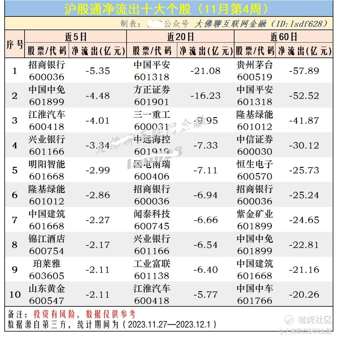 沪股通资金近5日近20日和近60日资金流入/流出前十股票: