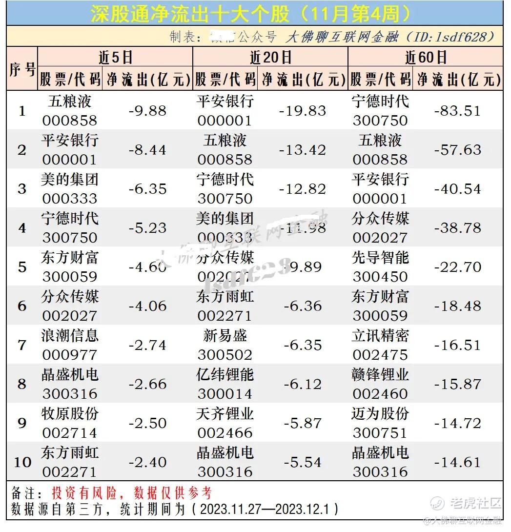深股通资金近5日近20日和近60日资金流入/流出前十股票: