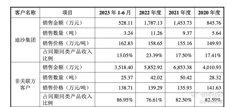 根据回复函,以原料药洛索洛芬钠为例,2020年至2023年上半年,对迪沙集团的销售均价分别为149.93万元/吨、155.16万元/吨、158.65万元/吨、162.83万元/吨,均要高于对非关联客户的销售均价。