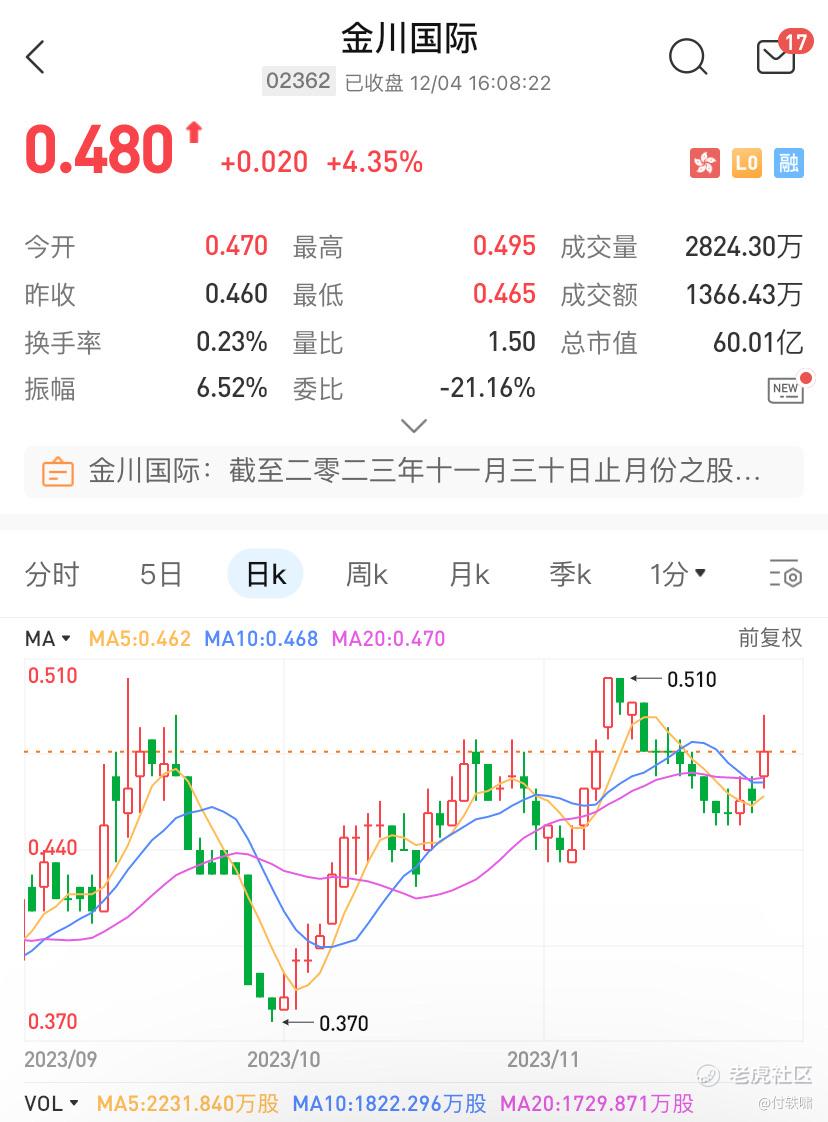 金川国际(02362.HK)今日上涨4.35%,报收0.48港元。