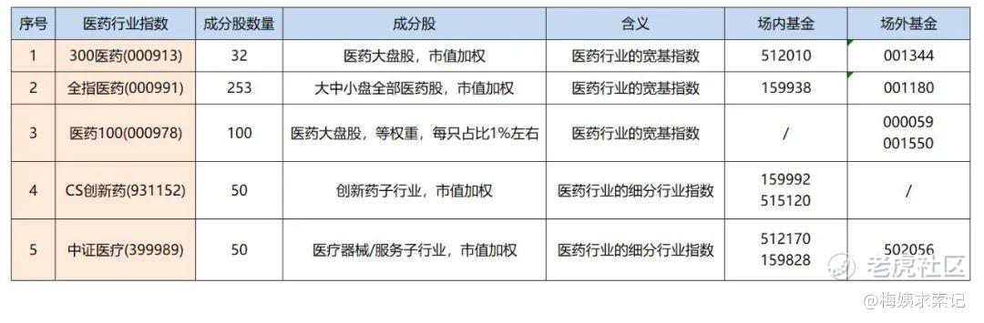 A股的医疗医药相关指数,梅姨曾经在《行业指数基金定投(一)定投医药行业,有哪些指数基金可以选择?》中介绍过。比如说,中证医疗、CS创新药、全指医药等。当时还贴过这样一张汇总表: