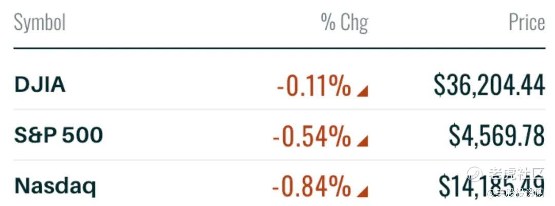 截至收盘,道指跌幅为0.11%;纳指跌幅为0.84%;标普500指数跌幅为0.54%。