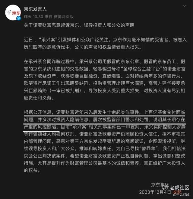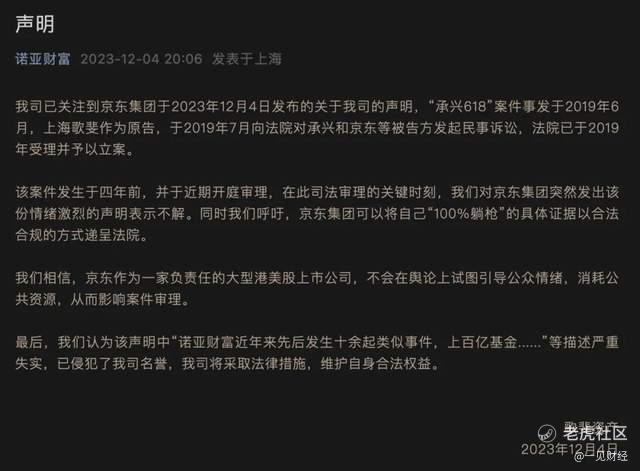 12月4日当晚,诺亚财富针对京东发布的上述声明也发了一封声明。