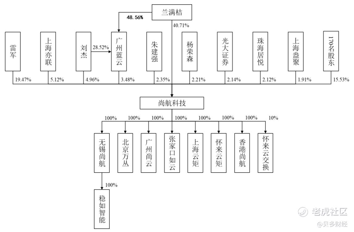 同时,雷军直接持有尚航科技19.47%的股份。此外,上海亦联持股5.12%,刘杰持股4.96%,朱建强持股2.35%,杨荣森持股2.21%,光大证券持股2.14%,珠海居悦持股2.12%,上海盎聚持股1.91%,其他170名股东持股15.53%。