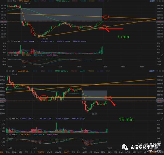 一方面是因为5分钟级别是对市场反映最灵敏的周期。所以少有反弹就会改变趋势。但它更多的是受到大周期情绪的影响。尤其是今天盘前如果低开在385下方,那么5分钟级别的支撑也就不复存在了 。我们看到,15分钟级别依旧受到之前上升趋势的压力。如果今天市场低开的话,稍微反弹无力依旧容易被空头打落。