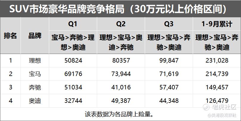 而在包括燃油车和新能源车的30万以上的豪华SUV市场,理想汽车交付量已经超过BBA,成为包括燃油车在内的,30万元以上SUV销量第一的豪华品牌。