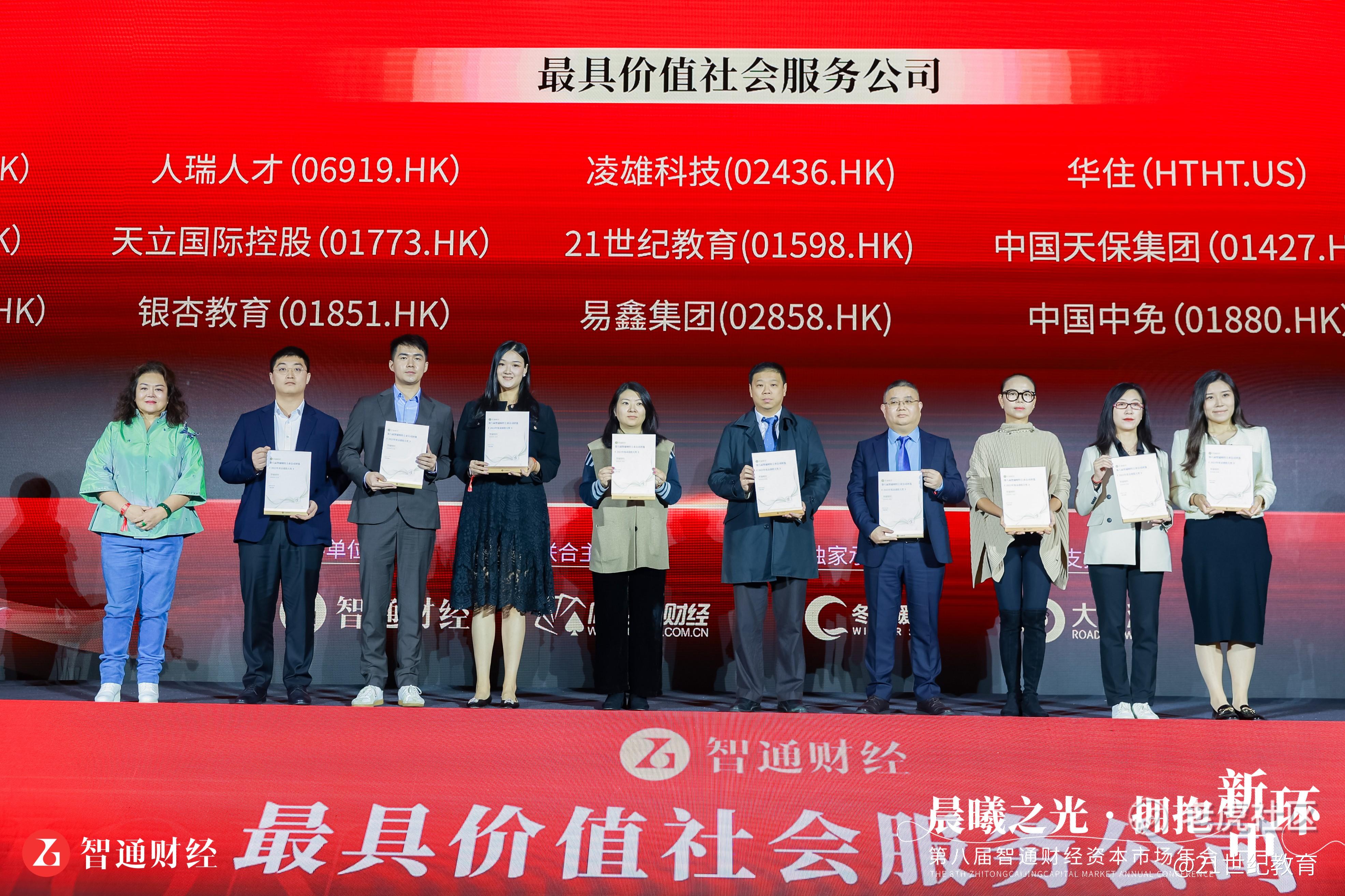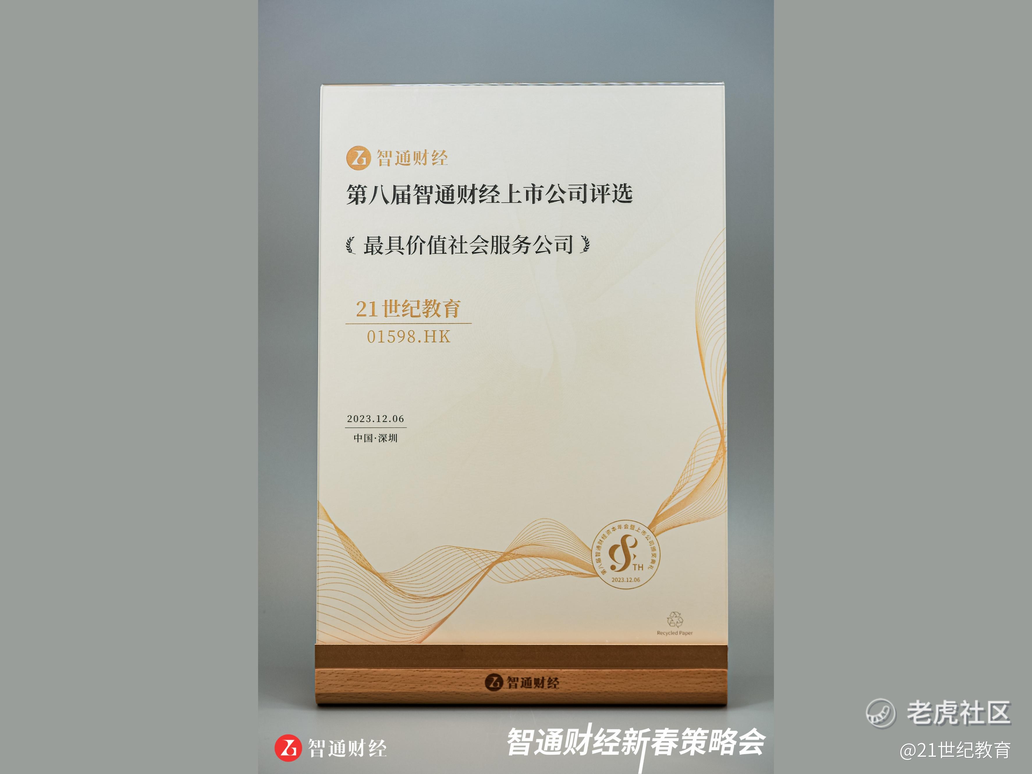 2023年12月6日,第八届智通财经资本市场年会暨上市公司颁奖典礼在深圳举行,21世纪教育(01598.HK)荣获“金港股最具价值社会服务公司”奖项。
