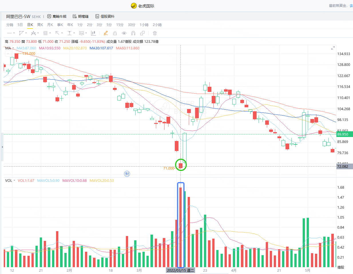 比如,2022年3月15日,阿里巴巴出现了底部放量的墓碑线,且第二天出现了明显的反包,短期形成了进攻向上的趋势。