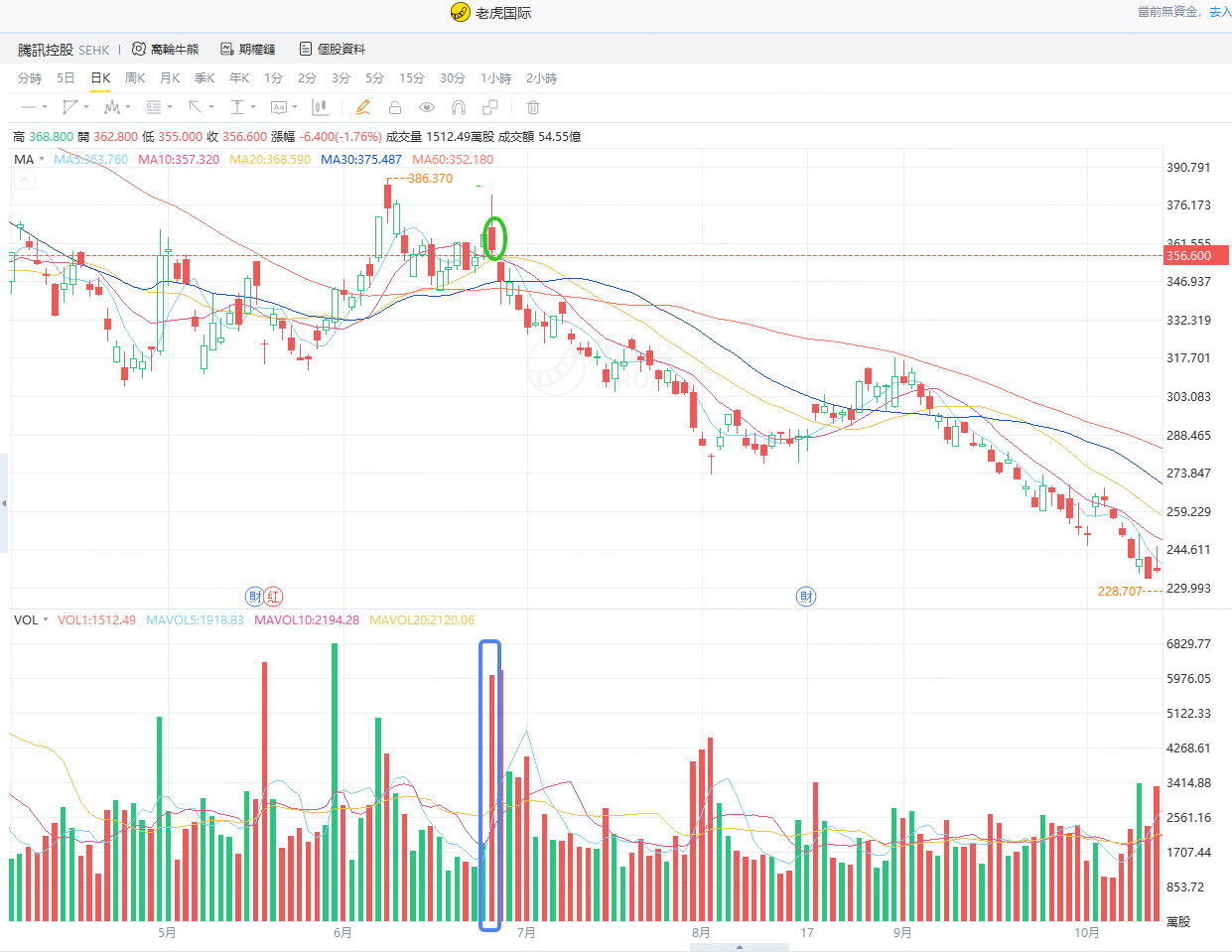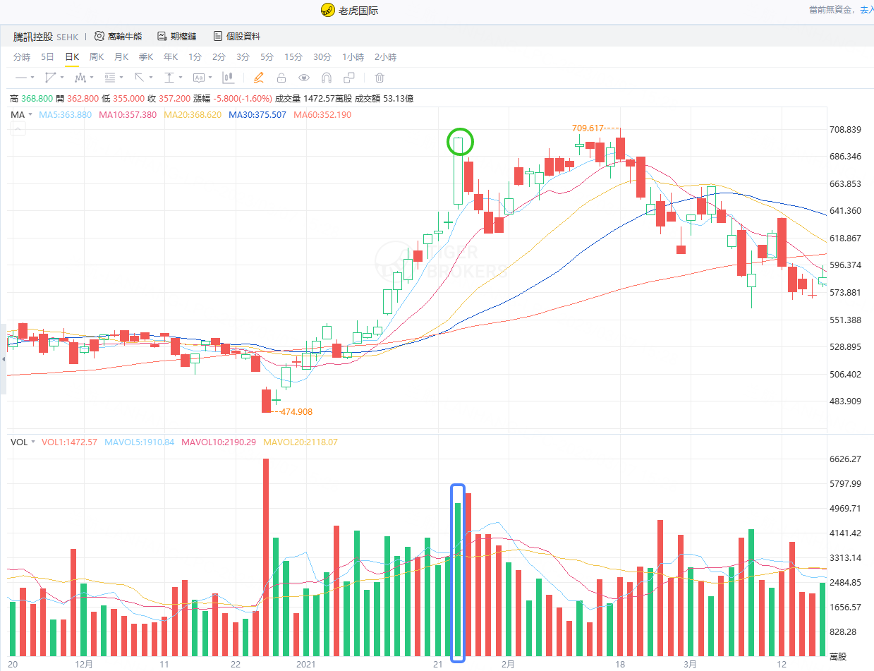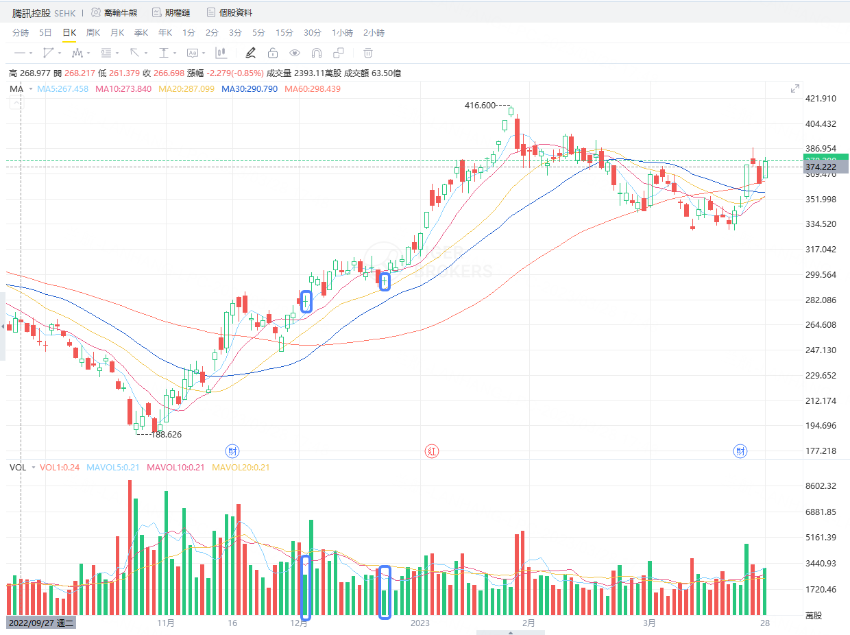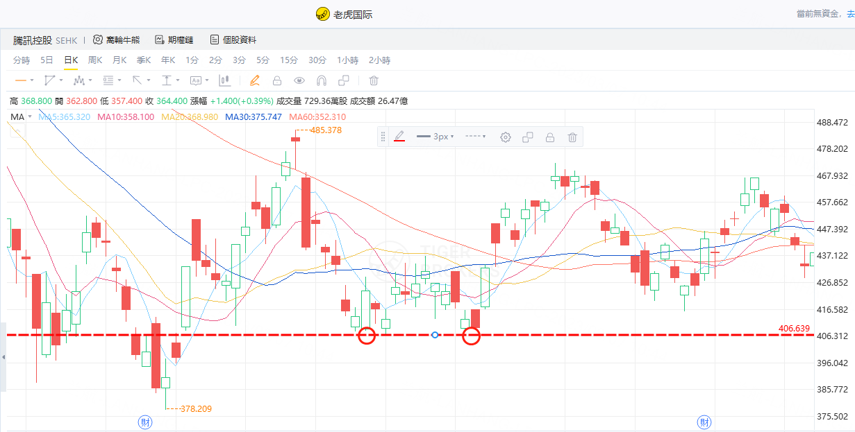 比如下图,腾讯控股的两个蓝色标记点位,我们就可以把它当作是中继点买点。