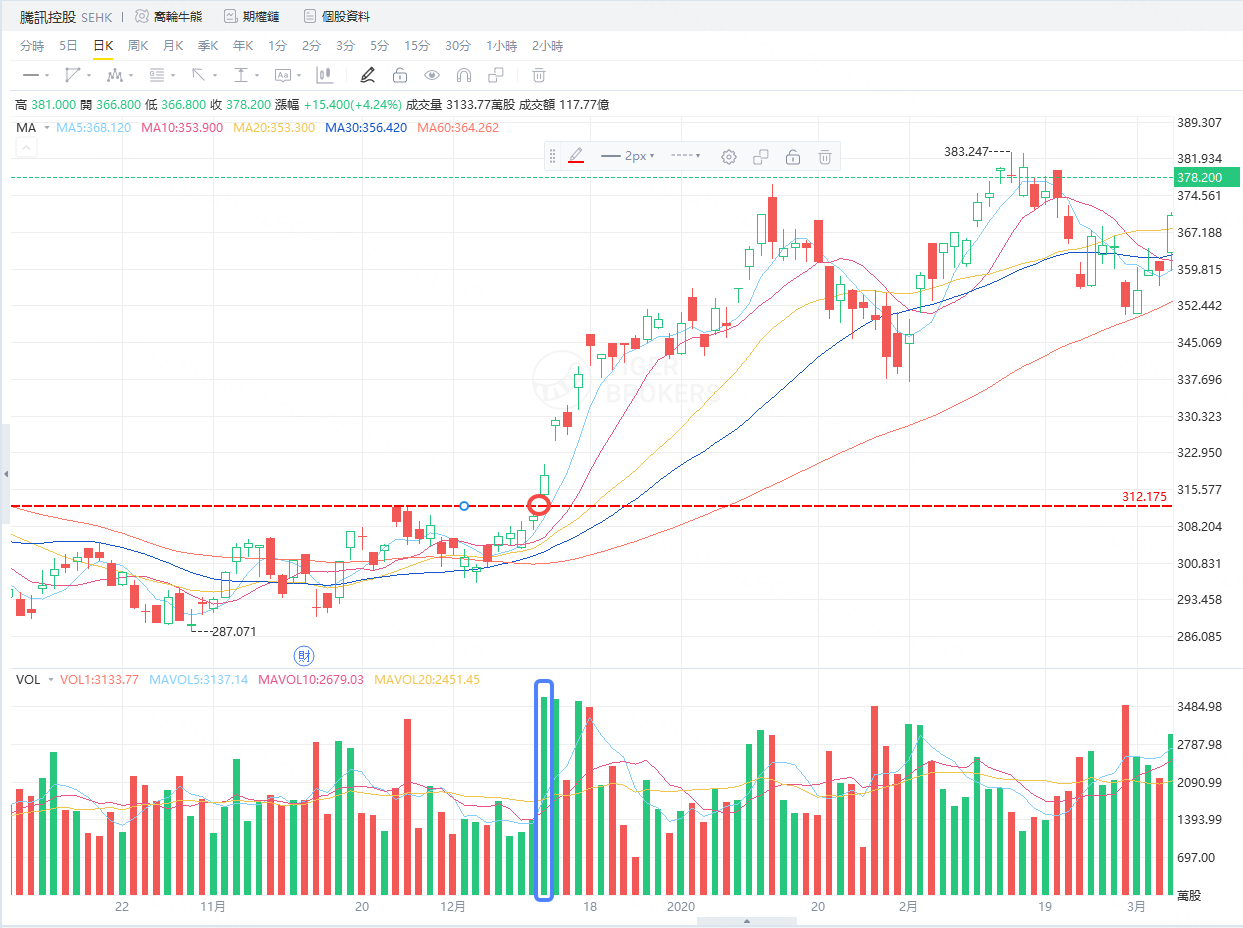 比如,2019年12月12日,腾讯控股跳空高开,形成缺口。股价突破区间顶部,并且这里成交量急剧扩大(上个交易日的2倍),形成了新的一轮上升趋势。