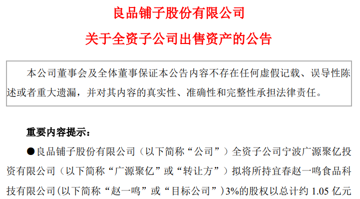 良品铺子10月17日的公告显示,公司全资子公司广源聚亿拟将所持赵一鸣食品3%的股权以总计约1.05亿元的价格,转让给黑蚁资本名下的翼嗨合伙企业和黑逸合伙企业,预计产生约6000万元的投资收益。交易完成后广源聚亿不再持有“赵一鸣”股权。