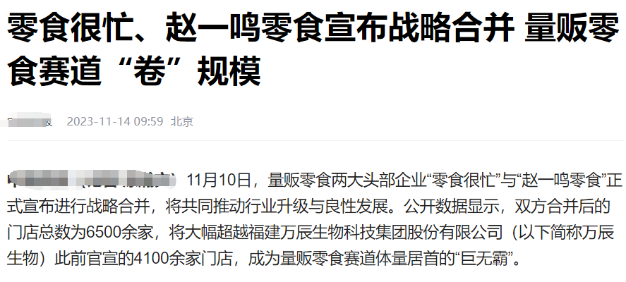 但没想到的是,在广源聚亿转让股权仅仅过了22天,即2023年11月10日,“赵一鸣”和另一家行业头部零食集合店“零食很忙”就对外发布“合并”声明,两家行业内打得火热的对手,居然联姻了。
