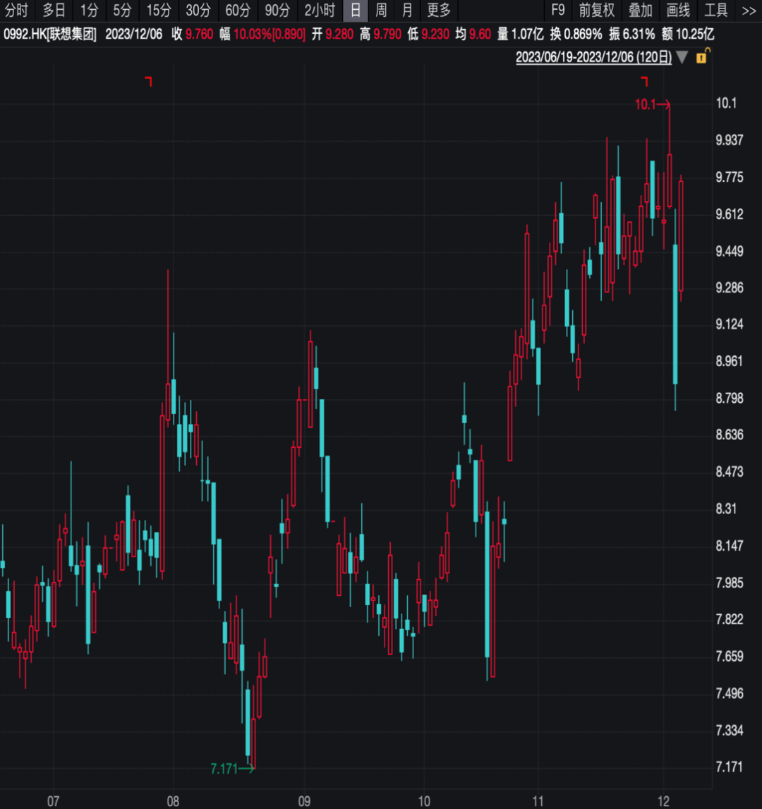 12月6日消息,恒生科指午后拉升, 联想集团涨超10%,报9.76港元,成交额5.66亿港元。