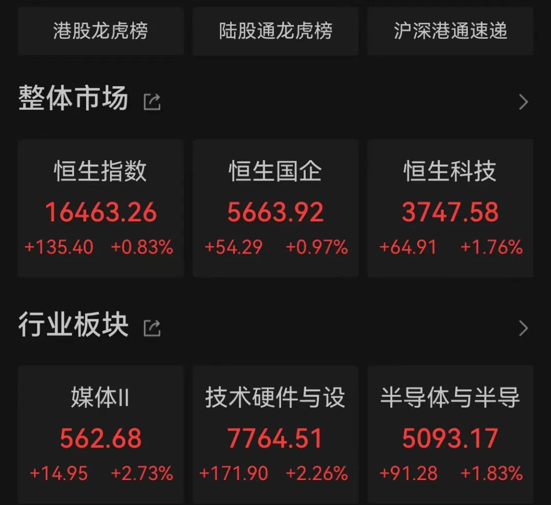 截至12月6日收盘,恒生指数报16463.26点,上涨0.83%;恒生国企指数报5663.92点,上涨0.97%;恒生科技指数报3747.58点,上涨1.76%。