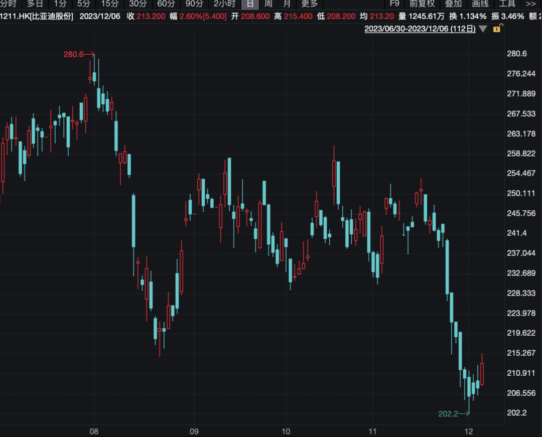 12月6日,新能源车龙头比亚迪涨2.6%。
