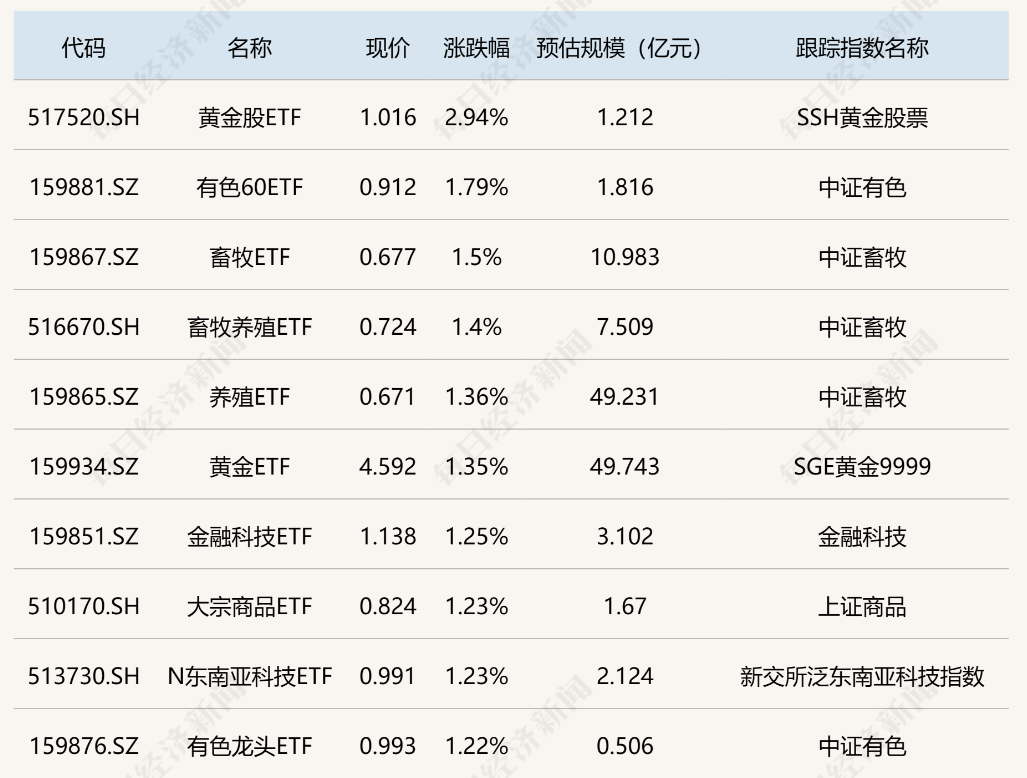 ETF方面,黄金、畜牧养殖相关ETF涨幅居前。[666]