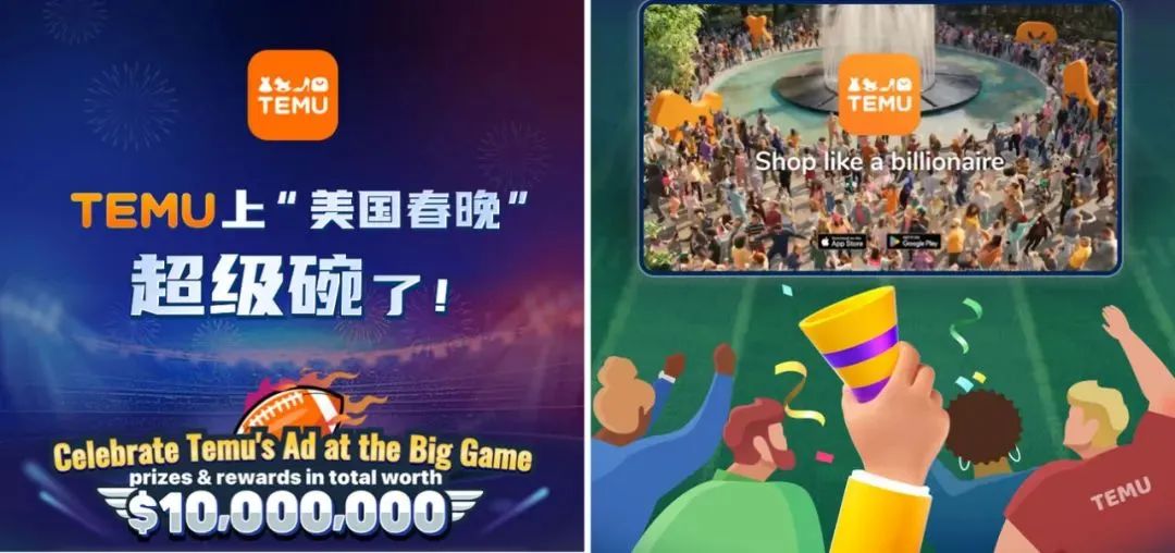 Temu出海首站选择美国,在打法上因地制宜。在国内,拼多多背靠微信私域裂变式传播,配合百亿补贴等营销手段,实现成功突围。但国外社交通讯App覆盖范围有限,私域打法难以走通,于是Temu选择从公域另辟蹊径。今年2月,Temu做成了一件国内互联网公司没做过的事,成功登上被誉为“美国春晚”的超级碗。