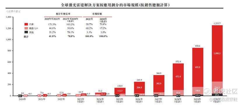 激光雷达作为一种重要的感知传感器,其市场规模和增长潜力巨大。根据招股书,激光雷达解决方案的全球市场规模预计将从2020年的46亿元人民币增长到2022年的120亿元,年复合增长率达到了61.8%。其中,汽车行业贡献了最快的增速。预计到2030年将会达到1.25万亿元人民币,2022年到2030年的年复合增长率达到78.8%,汽车行业的占比将会达到79.8%,成为激光雷达主要的需求方。
