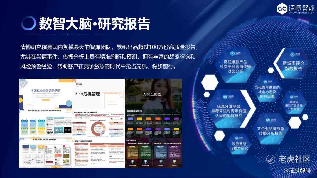 3、清博智能:http://home.gsdata.cn/ 清博智能是一家国内领先的人工智能科技创新企业,致力于实现“具身智能”目标,开发AI创新算法,挖掘海量数据潜在价值,让物理设备和实体世界融合为智能化整体。公司通过将AI技术赋予感知、分析和决策的能力,从而为客户提供更智能、更高效、更优质的服务。