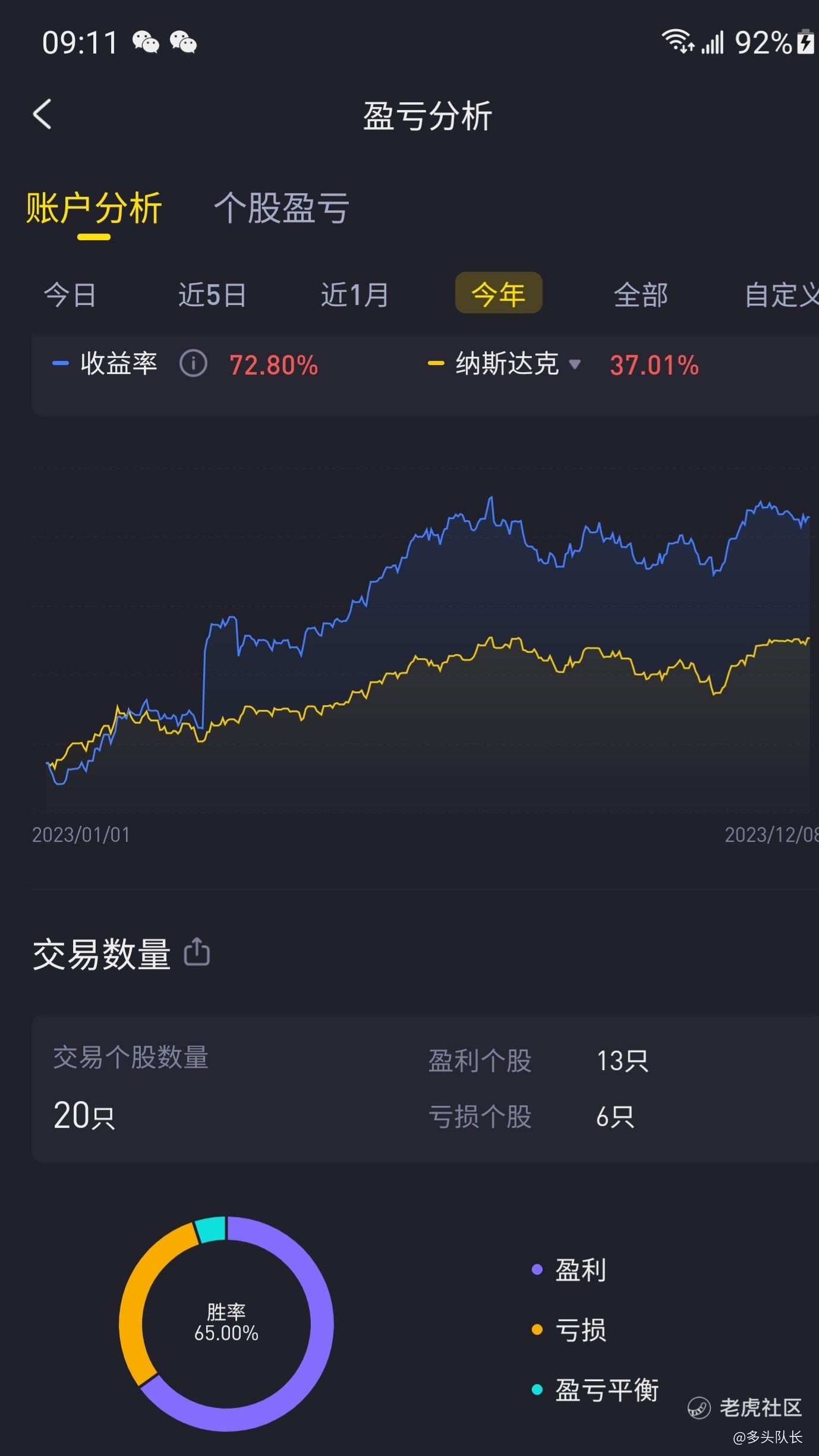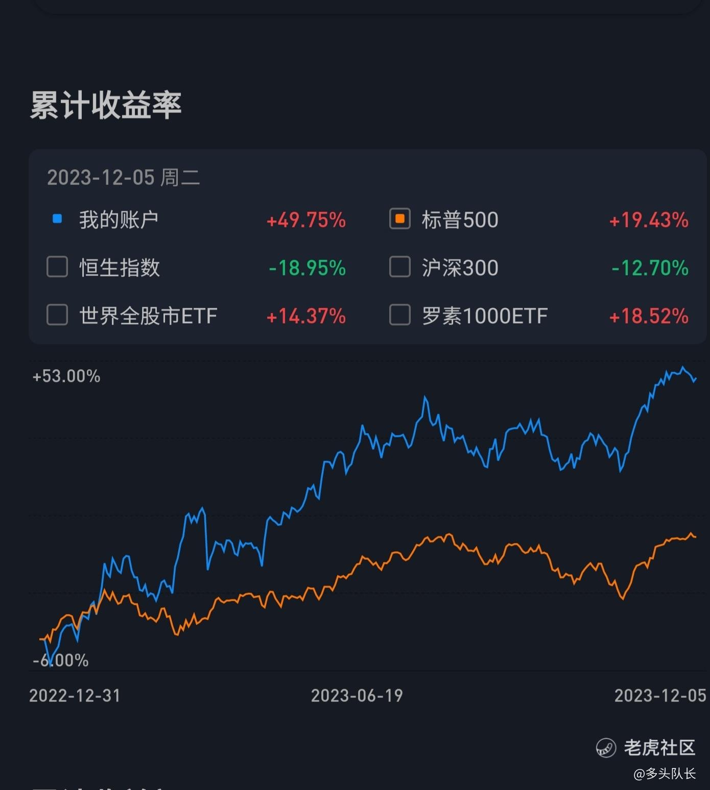 $老虎证券(TIGR)$ 今年已经到了最后一个月快结束了。今年还可以吧我比较对自己满意,有很多大神我无法去比肩,我只能做自己。我今年到现在总的年化收益还可以,每年我的目标就是跑赢纳斯达克,就是那么简单而又及其困难的事情。