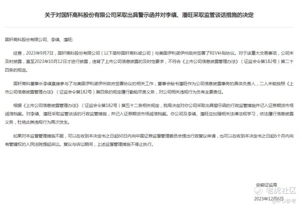 $国轩高科(002074)$ 【国轩高科信披不及时被警示,2人被监管谈话】12月7日,安徽证监局披露关于对国轩高科采取出具警示函并对李缜、潘旺采取监管谈话措施的决定。安徽证监局表示,经查,2023年9月7日,国轩高科与美国伊利诺伊州政府签署了REV补贴协议。对于该重大交易事项,公司未及时披露,直至2023年10月12日才进行披露,违背了上市公司信息披露的及时性要求,不符合《上市公司信息披露管理办法》第二十四条的规定。安徽证监局决定对国轩高科采取出具警示函的行政监管措施并记入证券期货市场诚信档案。对李缜、潘旺采取监管谈话的行政监管措施,并记入证券期货市场诚信档案。(中新经纬)