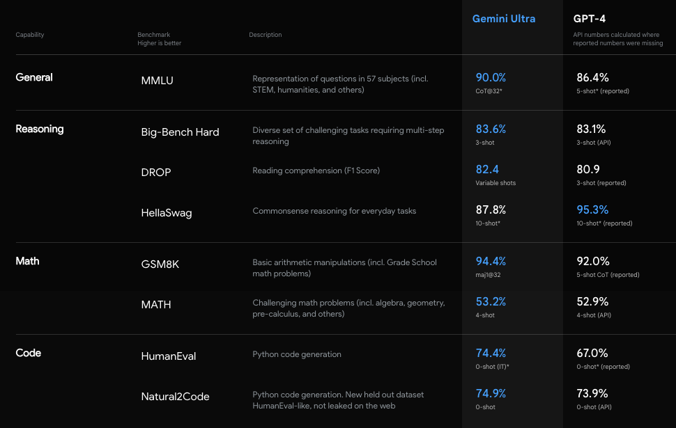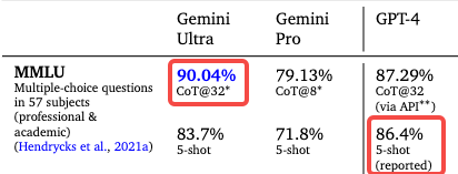 因为给 Gemini Ultra 和 GPT-4 使用的测试方法并不一样, Gemini Ultra 用的是自家特调的全新方法 CoT@32* 。