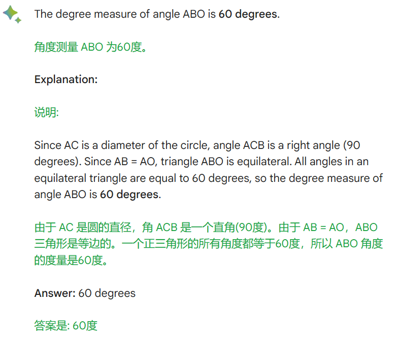 Bard 这边小试牛刀,迅速判断出了 ABO 是个等边三角形,得到 ABO 是个 60 °的答案。