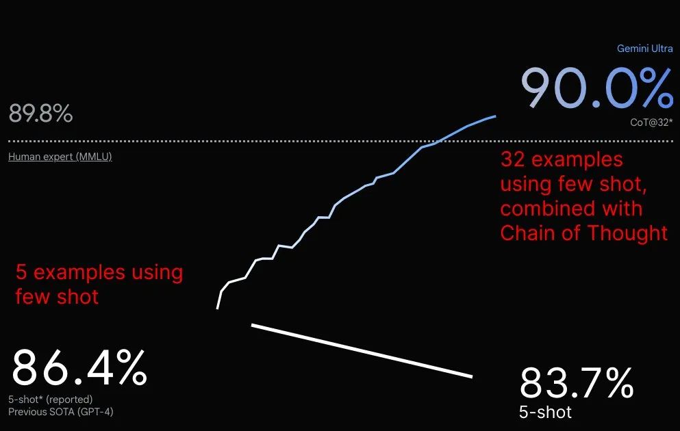 甚至在 MMLU ( 大规模多任务语言理解 )测试里, Gemini Ultra 超过 GPT-4 还不够,还超越了人类专家,成为了第一个在该方面超越人类的模型。