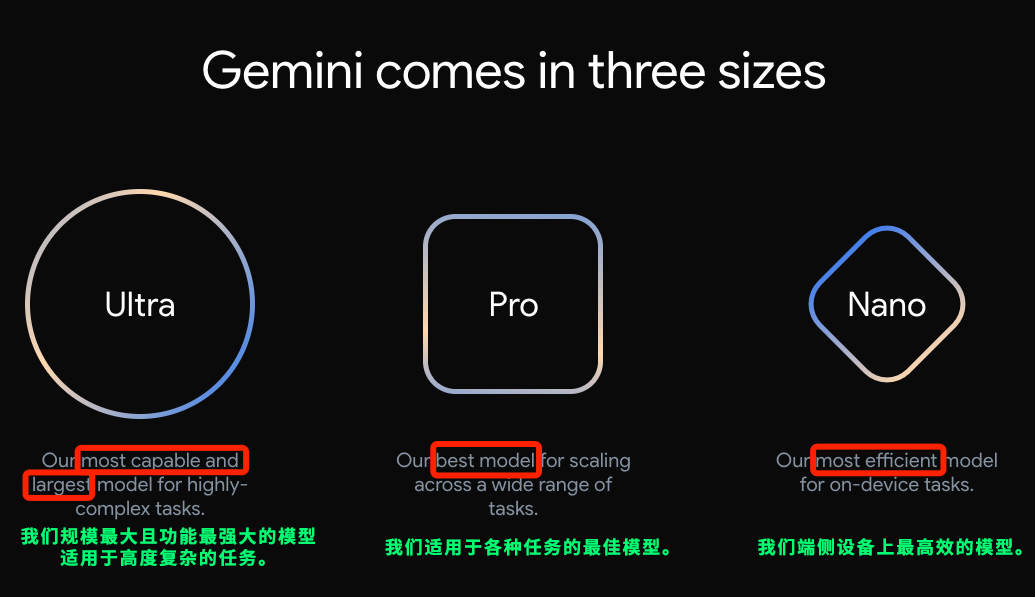 不过差评君仔细看了下发现,这次发布的 Gemini 其实是一个家族式大模型,分别是 “ 中杯 ”Gemini Nano 、 “ 大杯 ”Gemini Pro 和 “ 超大杯 ”Gemini Ultra 。