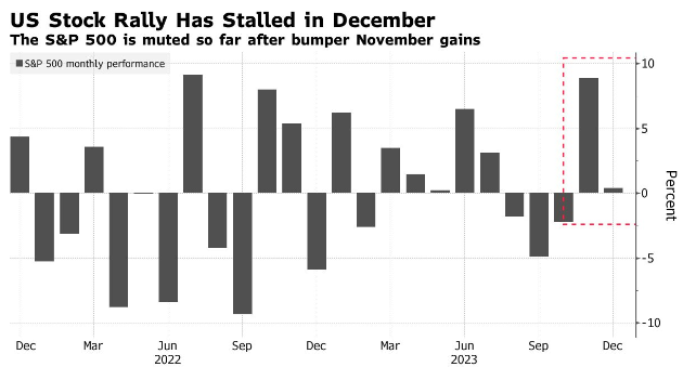 在经历了一个世纪以来最好的11月涨幅之一后,美国股市的涨势本月几乎陷入停滞,因为投资者还在衡量美联储可能何时开始降息。美国10年期国债收益率在10月底达到2007年以来的最高水平5%后,已回落至4.2%左右。
