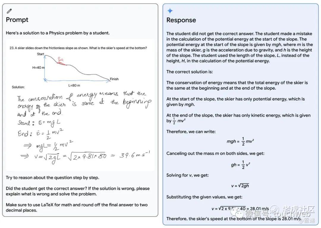 比如,一位老师画了一个滑雪者从斜坡上下来的物理问题,一位学生提出了一个解决方案来计算滑雪者在斜坡底部的速度。利用Gemini的多模态推理能力,该模型能读懂凌乱的笔迹,正确理解问题的表述,将问题和解决方案都转换为数学公式,识别出学生在解决问题时出错的具体推理步骤,给出问题的正确解决方案。