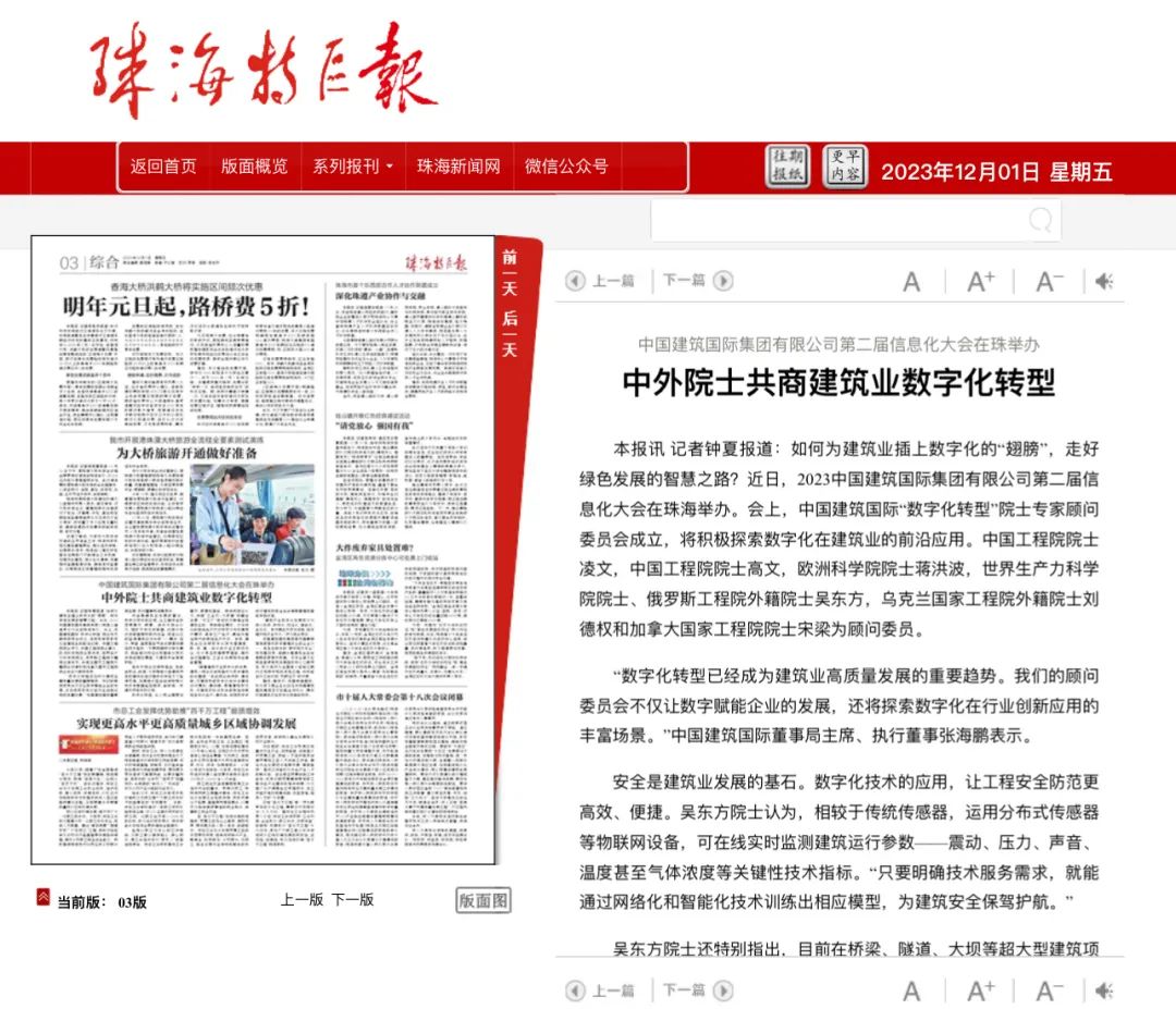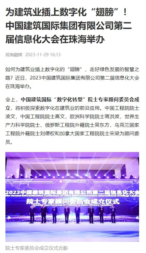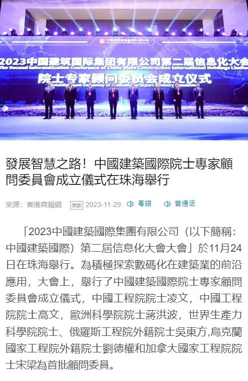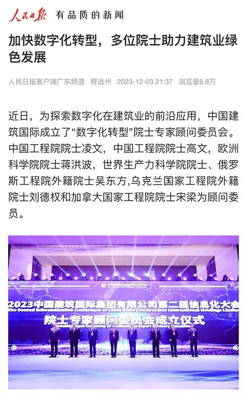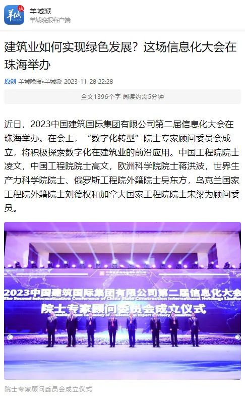 会上,为探索数字化在建筑业的前沿应用,中国建筑国际成立了“数字化转型”院士专家顾问委员会,并与多位院士共同探讨加快数字化转型的新路径,助力建筑业绿色发展。多家中央媒体及粤港澳大湾区主流媒体对活动进行了报道。为您分享——