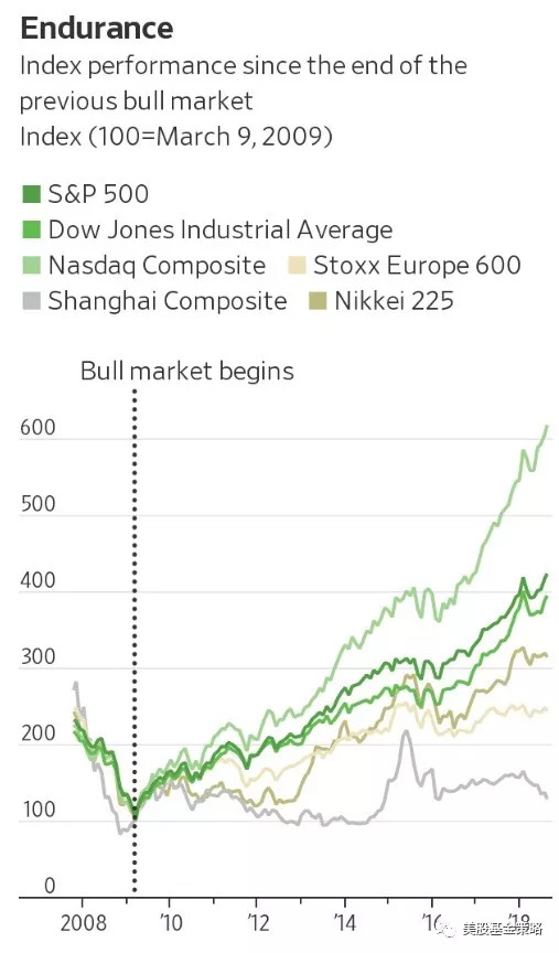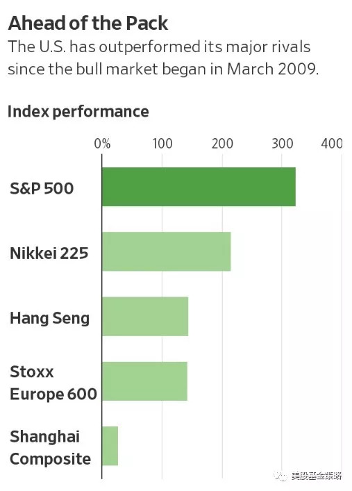 美股本轮牛市放在全球也是傲人的,以2009年3月9日的市场低点为起点,记为100点,此后美国大牛市期间,纳斯达克综合指数涨幅超过5倍,实在惊人,而标普500指数和道琼斯工业指数也有3倍左右的收益。与之相比,全球其它主流指数就显得弱了很多,排在最下面的是我们熟悉的上证指数,这就让人五味杂陈了。