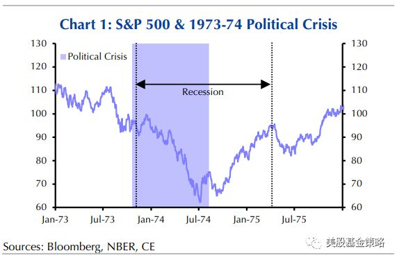 看看1973到1974年尼克松被弹劾期间标普500指数表现,我们知道不但弹劾,而且成功让其下台。咋一看,市场影响很大,股市暴跌啊。但是请注意,当时整个美国经济本身就进入了一个萧条衰退期,更关键的是,1973年10月,第四次中东战争爆发,从而触发了第一次石油危机,油价从3美元左右快速上涨到10美元以上,对欧美经济产生了巨大打击。所以,在这样的能源和经济危机中,叠加政治危机确实对股市有明显的影响,但是我们也要分清主因。