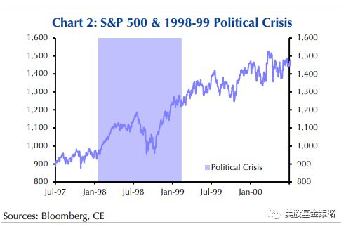 再看看克林顿被弹劾期间,那是1998年到1999年,那个时候美国经济整体表现很强劲。