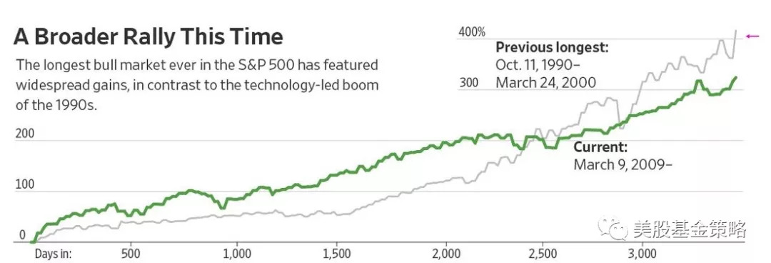 终于,2009年3月开启的本轮牛市倔强的奔向史上最长牛市,尽管同期涨幅不能跟1990年代相比(从今往后,提克林顿,就不要马上想到莱温斯基了,人家还有美国经济繁荣期,有大牛市啊),但是步伐依然坚定。关于美国股市为啥这么强劲,我曾经有篇文章说说了自己的看法,也提到了90年代大牛市的一些背景,有兴趣的朋友可以看看《深度 | 二战后竟有11次牛市,两次持续百月以上,美国牛市不断的原因在哪里?》。