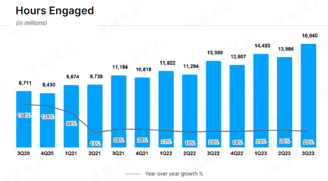 截至2022年Q4,总计用户使用时长达到128.07亿小时。2023年Q3,该数据更是达到160.4亿小时。